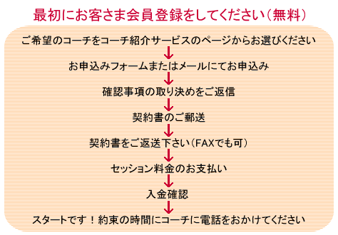 コーチングの受け方・・・・・・・・・・・・・・・・・・・・・・・・・・・・・・・・・・・・・・・・・・・・ コーチングを受ける流れ――― ![]() ※ 2007年3月19日から、お申し込み及び契約の取り決めは、お客様とコーチで直接、行なっていただくことになりました。 契約はワンクール3か月です。3か月過ぎたら1ヶ月単位 での自動更新となります。3ヶ月で終了するのも、もっと続けるのも、あなた の自由です。なお、テーマによっては一年、二年とロングスタンスでプラン ニングするものもありますが、その場合でもスタートする前に十分に話し合 いをして取り決めをします。あなたにあったコーチをご紹介しますので、ま ずはお気軽にご相談ください。また、サンプルセッションをご希望の方はライフコーチジャパンまでお知らせください。 コーチングを受ける際に知っておいていただきたいこと――― ・料金は前払いになっています。セッションを始める5日前までに担当のコーチ宛に振込んで下さい。 ※予約された時間は、あなたのために空けてありますので変更・調整は前もってお願い致します。 ・あなたが話したくないことは話さなくてかまいません。 ・コーチは守秘義務があります。あなたが話した内容は、あなたの承諾なしに外部にもれることは一切ありません。 |