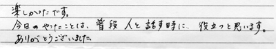 ![]() はじめまして♪ ![]() 楽しいペアワーク でワイワイ。 ![]() 「聴く」「伝える」 ワークでドキドキ。 |