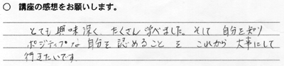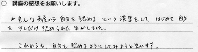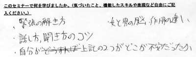 ◆恋トレ◆ 今回もやや男性が多めな人数構成でした。 そして、いつもの「聴く」「伝える」のワークではなく「ニーズ」や 「5年後の自分と出会う」という心理的ワークを初めて取り入れ、 なおかつ「男女の機能しないコミュニケーション」の実体験をして いただきました。 これがまた、みなさんをイヤ〜な気持ちにさせる実習で (そんなことして、どーするんだYO!)そういった中で、 男女の役割を変えることによって、 いろいろな気づきを得ていただけました。 ちょこっと感想を。 「脈略のない話し方をやってみたけど難しいね!疲れた! でも、いつも自分はこれを聞く側なんだよなあ」←男性。 「目を合わせずに話を聞いてたら、聞こえてこないのね」←女性。 後半のニーズでは、普段ではそこまで感じないような、本来の自分のありかたに触れる ような質問や、また、最高の自分だったらどうするのか?などをテーマにして、みなさ んそれぞれ、輝やく表情で未来や価値観を語っていただきました。 すっごく良いセミナーだったのですが、惜しむらくは時間配分の計算がずれまして、 最後にインプロ21ができませんでしたぁああ(無念)あと、3分で会場を出なくちゃ! ということで、みなさんに会場のお片付けを手伝っていただきました(ありがとうございました) 次回からの改善点として、考えさせていただきます。 そしてなによりも、みなさんがイキイキとお話しをされている姿を見せていただき、 主催者にとっても心の豊かさをいただいたセミナーでした。 ◆恋トレ◆ 今回は男性の参加者が圧倒的に多く、男女の差異についての話し合いの場がさらに活性化されました。 また、よくある男女の会話デモンストレーションでは「まるで自分のようだ」という声がたくさんあがりました。 「話を聞いてくれなければ、心を開くことができない」という女性の意見に対して、 「おもしろくないから聞きたくない」「またか、、と思う」などの男性からの率直な 辛口コメントも出て盛り上がり、そのうえでどうしたらより良い関係を築けるのかに 焦点を当てました。 そのあと「目の前の人を尊重して聴くワーク」「本当の思いを伝えるワーク」の他にも、 「未来の自分に会いにいく」ワークをして終了!! 今回は、本当に大切なものは何なのか・・・ そんなことを感じていただけたらいいなという主催者の主旨が乗せてお届けしたセミナーでした。 ◆恋トレ◆ にぎやかな自己紹介から始まりました。次に、講師が男女のコミュニケーションスタイルのギャップと 理由を、実例をあげて説明。参加者から「そーだよねえ」と納得の声が。 そして「女性の部下が打ち解けてくれない」「彼が忙しがって話を聞いてくれない」 「彼女が急に怒り出す」などなど、いろいろな側面を座談会形式でシェアリングして、 改善策を一緒に見い出しました。 そして、伝えたい意図が伝わらないのはなぜ?というところに焦点をあて、機能するコミュニケーションのありかたを実践。 コーチングをベースに『本当に聴くこと』『しっかりと伝える』をテーマに、すぐに使える実用的なコミュニケーションスキルをお伝えしました。 男女とヒトコトで言っても、夫婦、上司と部下、彼氏彼女、シングルのひと、いろんな側面がありますが、 違いを認識して活かすことで、それぞれの関係性はもっとよくなる!そういった感覚を得ていただいて、終了! |